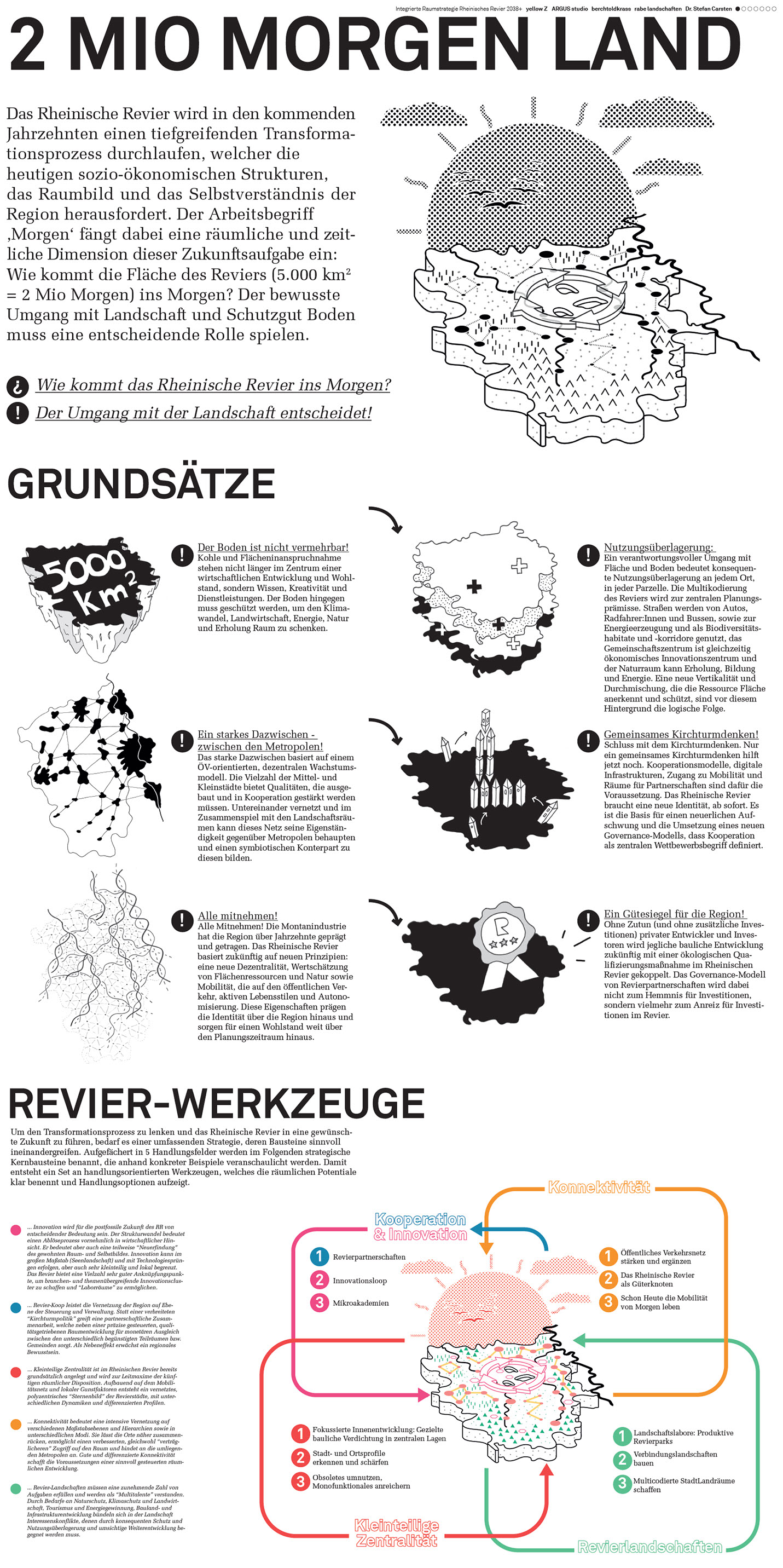 The Rhenish mining district is undergoing a profound transformation process, which challenges today's socio-economic structures, spatial structures and the self-image of the region. The working term 'tomorrow' captures a spatial and temporal dimension of this future task: The area of the Rhenish mining district covers about 5,000 km2, which corresponds to about 2 million acres. The numerical numbering of the area size is intended to illustrate the finite and irreproducible nature of the resource soil, which demands conscious and responsible handling. Tomorrow as a temporal dimension underlines the immediacy and directness of the transformation process in the mining area.
